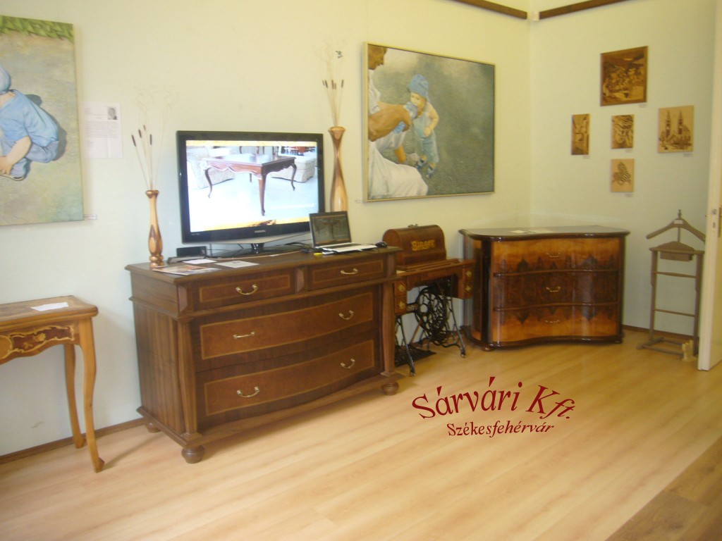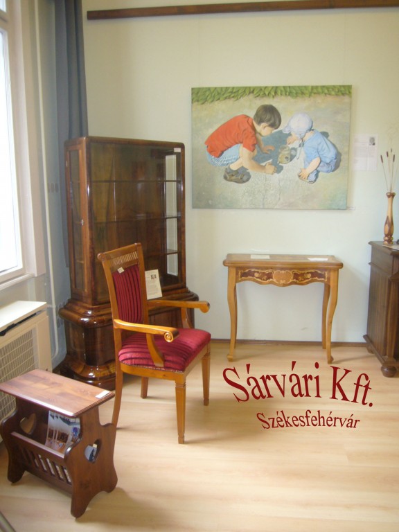Újságtartó, Karosszék, Restaurált vitrin, Intarziás kártyaasztalka, Diógyökér berakásos komód, Favázák, Felújított "Singer" Varrógép, Diógyökér komód, Szobainas, Intarzia berakások képek. |